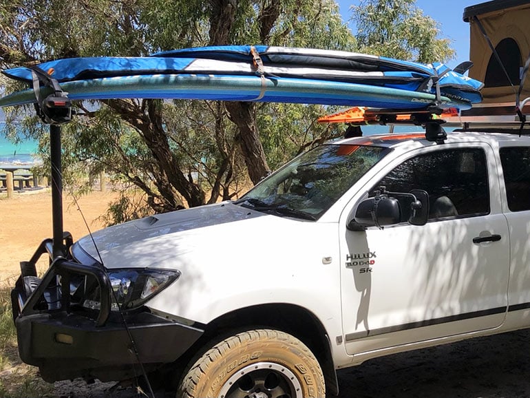 露營時用來載運衝浪板或SUP。筆者家經常去衝浪,因此這個工具已成為不可或缺的裝備。