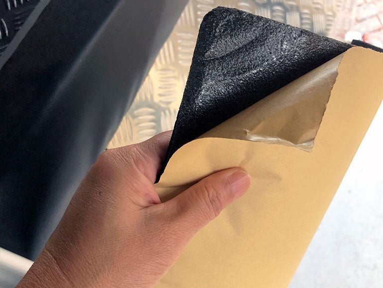 因此,筆者們決定購買隔熱防音海綿墊來貼在天花板上。這種材料可以直接撕下背膠貼上,邊緣多餘的部分則用剪刀修剪至適合的大小。