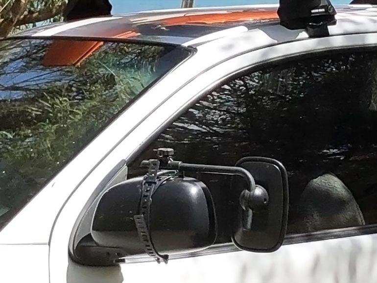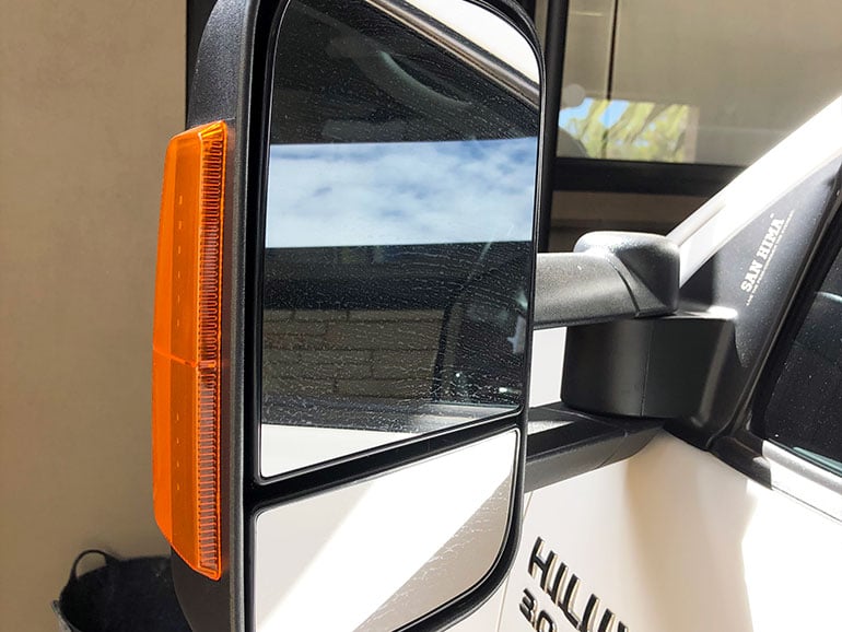 筆者的Hilux貨斗上安裝了貨艙蓋,因此原廠的側後視鏡無法清楚看到後方的狀況。筆者曾安裝過輔助後視鏡,但由於固定不夠牢固,在長途行駛或高速行駛時,鏡面角度常會移位,需要不斷地重新調整。