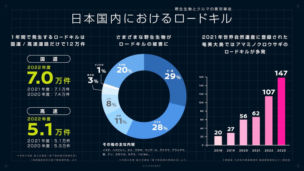 根據國土交通省與環境省的資料彙整,2022年度日本國道發生約7萬件路殺事故,高速公路也有5.1萬件,總計約12萬件。換算下來,每天約有300隻以上的動物命喪車輪下。