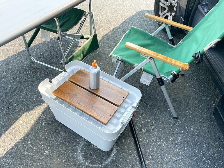 將收納箱的蓋子反過來,上面再擺上木板就可以變身為小桌子使用。