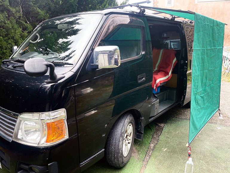 筆者想要像尾門那樣,在雨天也能輕鬆打開車側車門。因此就自己做了這個天幕。