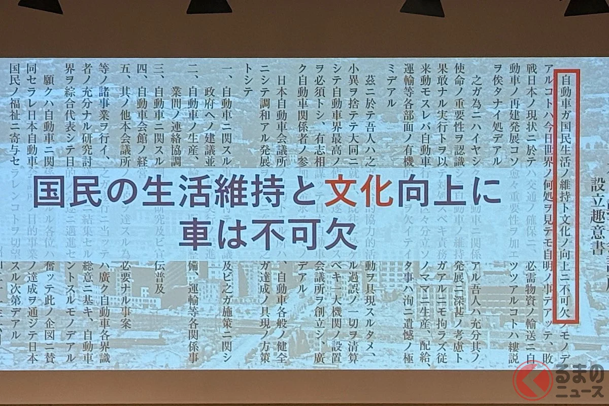 「成立當時的宗旨書中寫道:『汽車對於國民生活維持和文化提升不可或缺』。 多虧大家的努力,現在汽車在日本人流、物流方面扮演著不可或缺的角色。 然而,作為一種文化,汽車是否對日本有所貢獻了呢?」