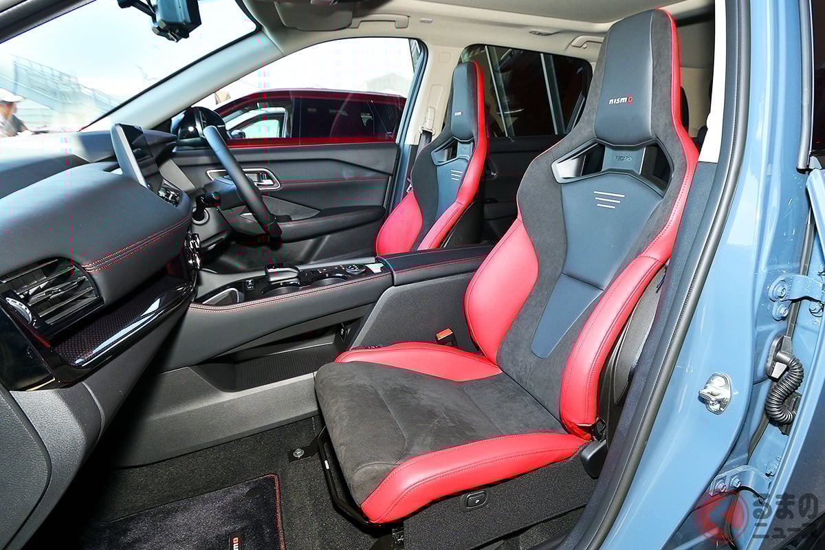 內裝為兩排座、5人乘坐,黑色基調兼具運動感與質感,配備紅色縫線的 NISMO 專屬座椅(布+合成皮)、紅色中央標記專屬方向盤、駕駛座與副駕駛座電動座椅。選配還可升級 NISMO 專屬 RECARO 運動座椅,採用 Alcantara 與皮革材質。