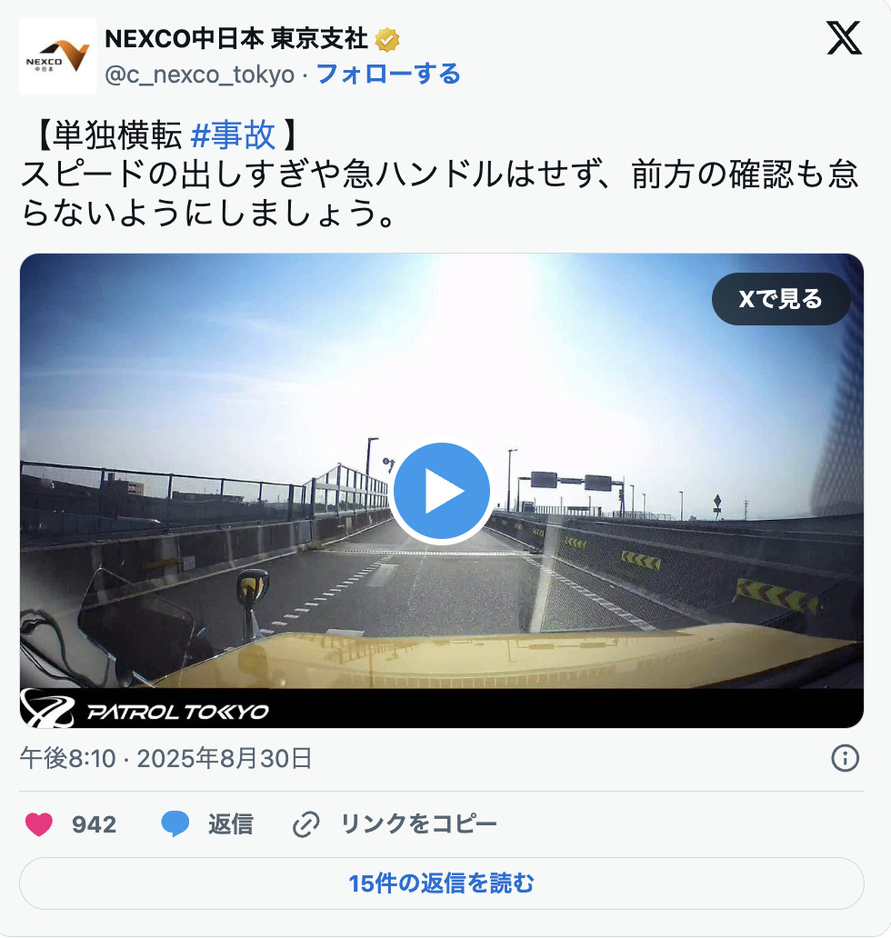 NEXCO 呼籲注意,提醒這是「單獨事故」案例