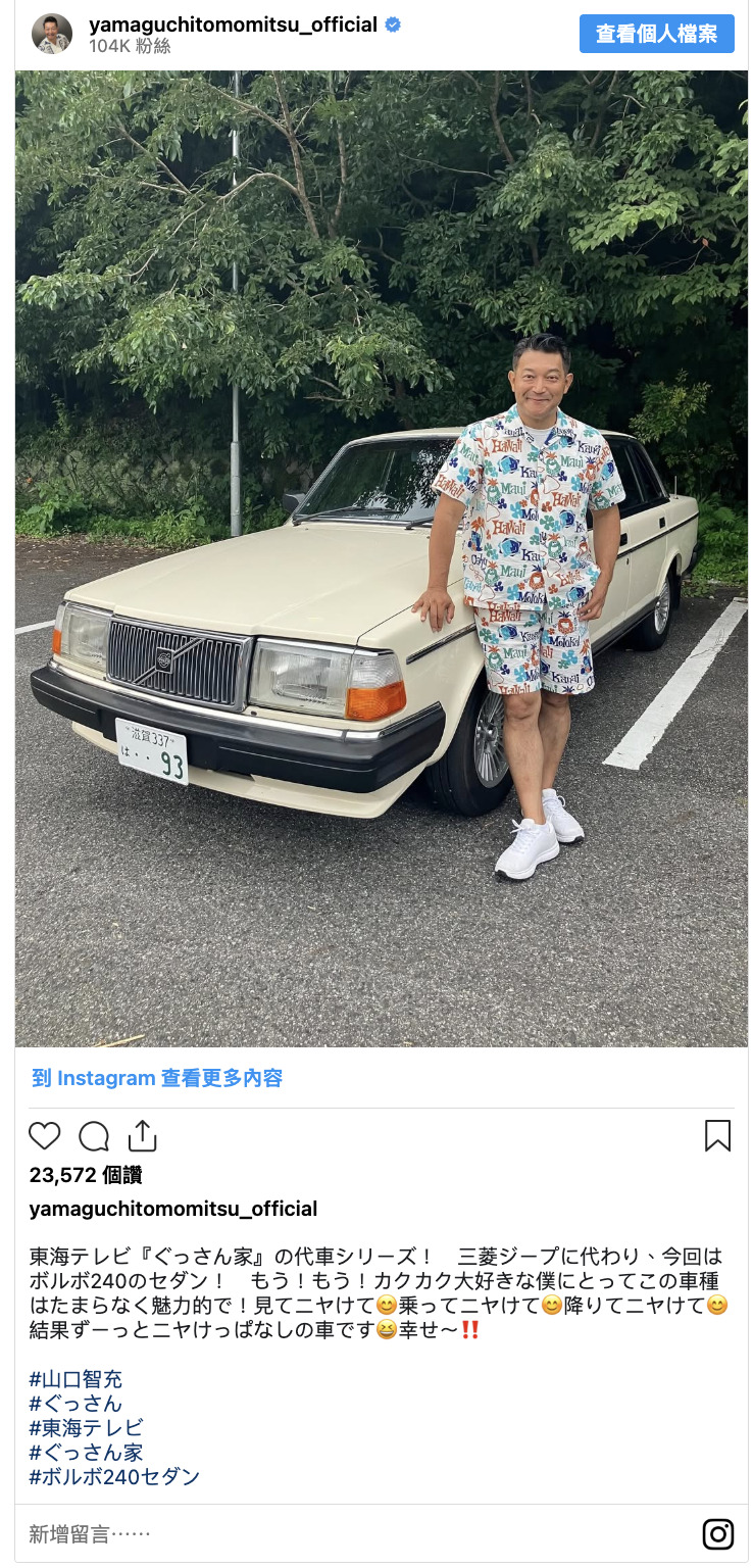 這則貼文是山口先生在節目裡遇到的代步車,而照片中可以看到他和一台奶油色的 Volvo「240 轎車」的合照。
