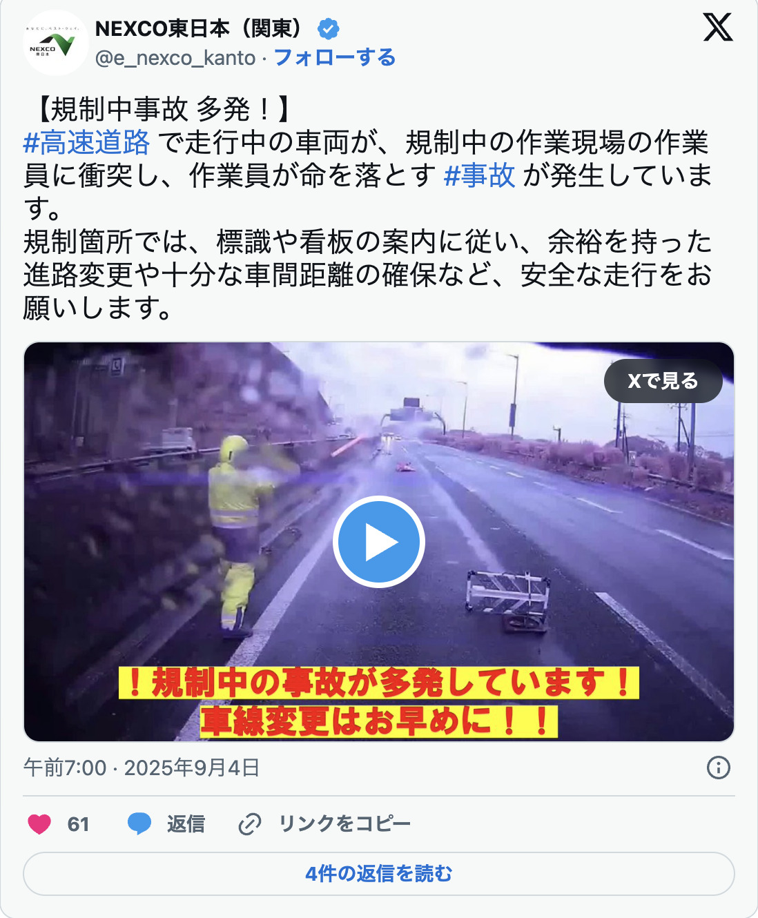 NEXCO東日本在官方社群媒體上,以「施工區事故頻發!」為題發布影片,提醒駕駛注意。