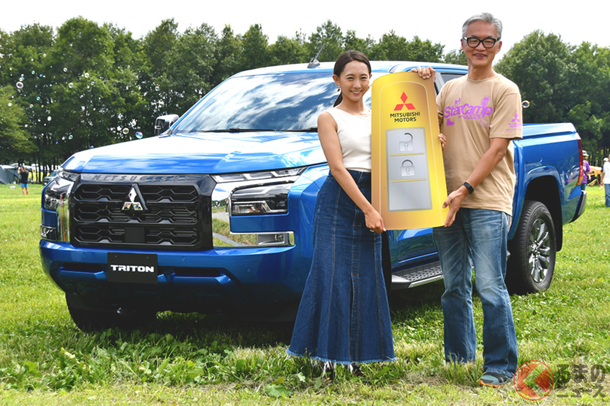 交付的車款是於2025年4月改款時追加的新色「Impulse Blue Metallic」Triton,東先生表示:「這個顏色和沖繩的海水顏色很搭!」三菱汽車副社長中村達夫先生也出席了交車儀式,將大型鑰匙……不,是智慧型鑰匙親手交給東先生。