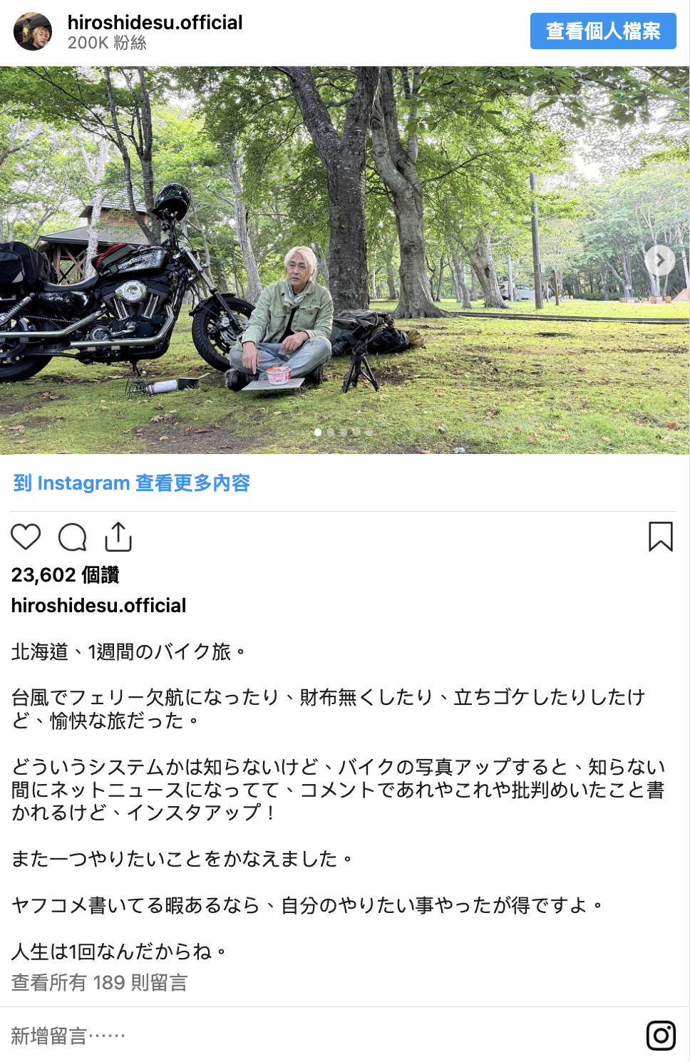 搞笑藝人,同時也是「單人露營達人」的ヒロシ,最近更新了自己的 Instagram,分享他騎著愛車到北海道旅遊的點滴。