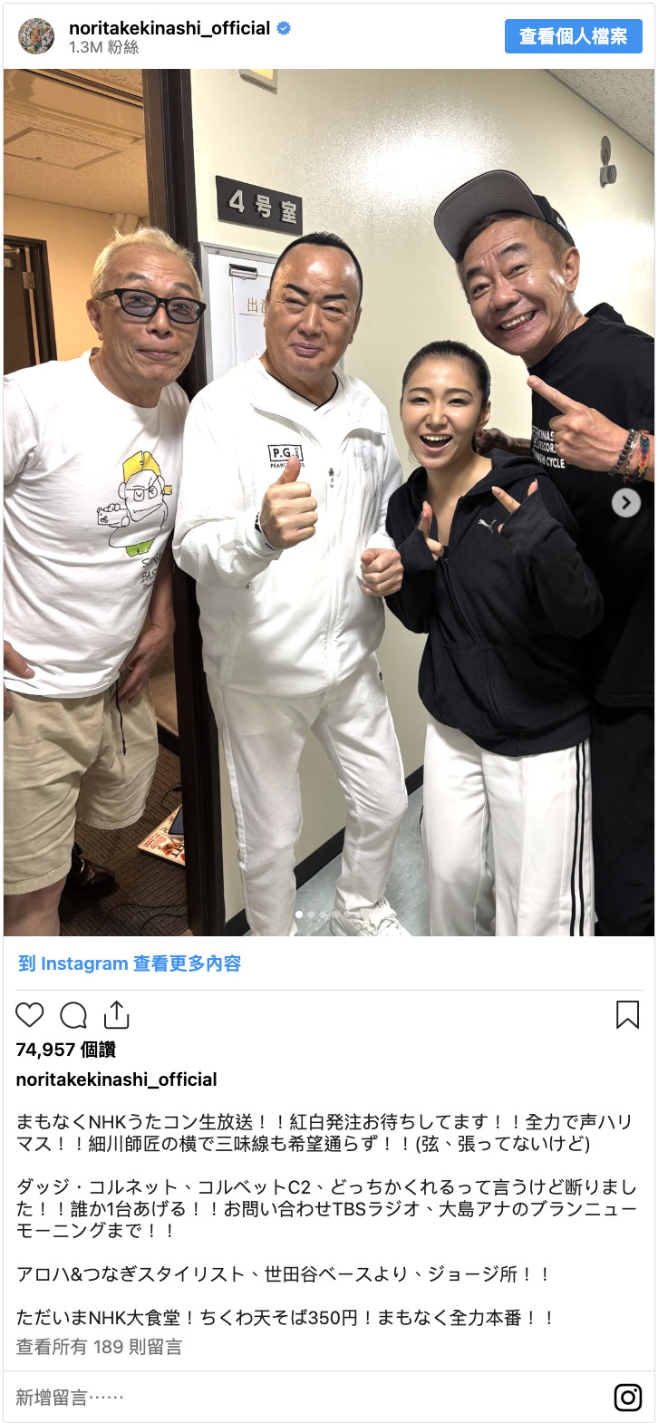 2025年9月9日,搞笑二人組「とんねるず」的木梨憲武更新了自己的Instagram。