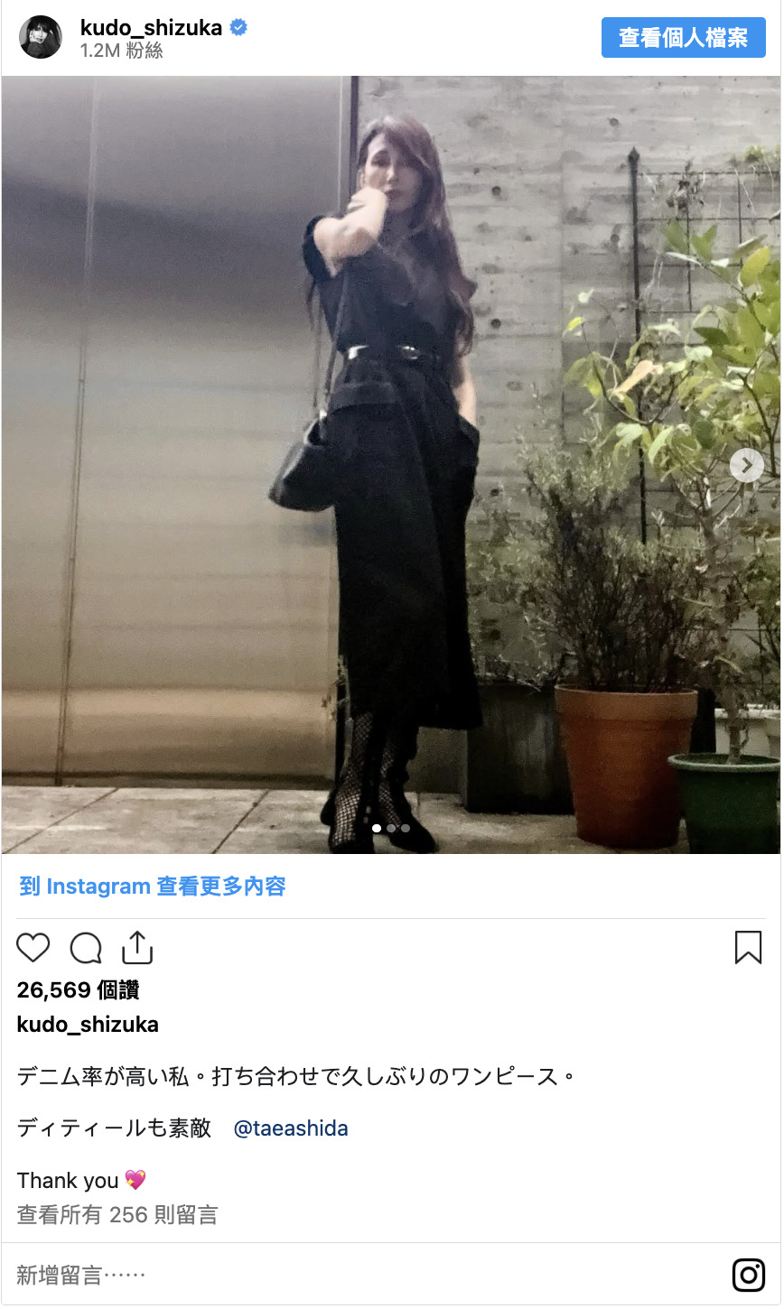 此次的 Instagram 貼文中,她寫道:「我穿牛仔比例很高。這次開會久違穿了洋裝」「細節也很棒」,並展示了一套黑色洋裝搭配黑色包包的簡約時尚造型。