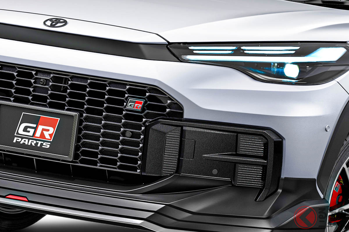 「GR 前下擾流」能夠整理前方氣流,同時覆蓋前輪以抑制亂流。外觀以消光黑與槍灰色為基調,中央配有象徵 GR 的紅色飾板,凸顯運動氣息。材質為 ABS 樹脂,安裝後車身離地高度降低約 23mm,車長增加約 52mm。