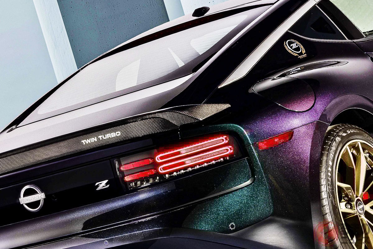 車身側面使用1980至90年代的復古字體,呈現「TWIN TURBO」的青銅色標誌,尾門同樣搭配TWIN TURBO標誌的專屬碳纖維尾翼。此外,還提供曾在Z32及Skyline GT-R上使用的「午夜紫(Midnight Purple)」車色。