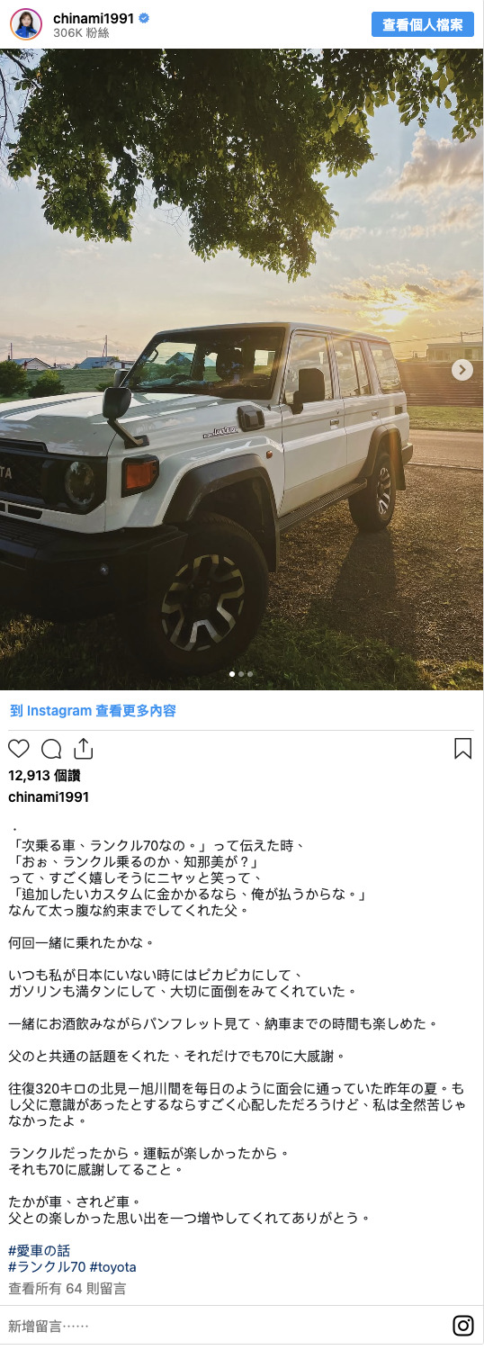 這台Land Cruiser 70過去曾是吉田與已故父親的回憶座駕,因此也引發話題。她在貼文中寫道「終於可以伸個懶腰」「終於能看看天空了」,洗車後的愉悅心情躍然紙上。