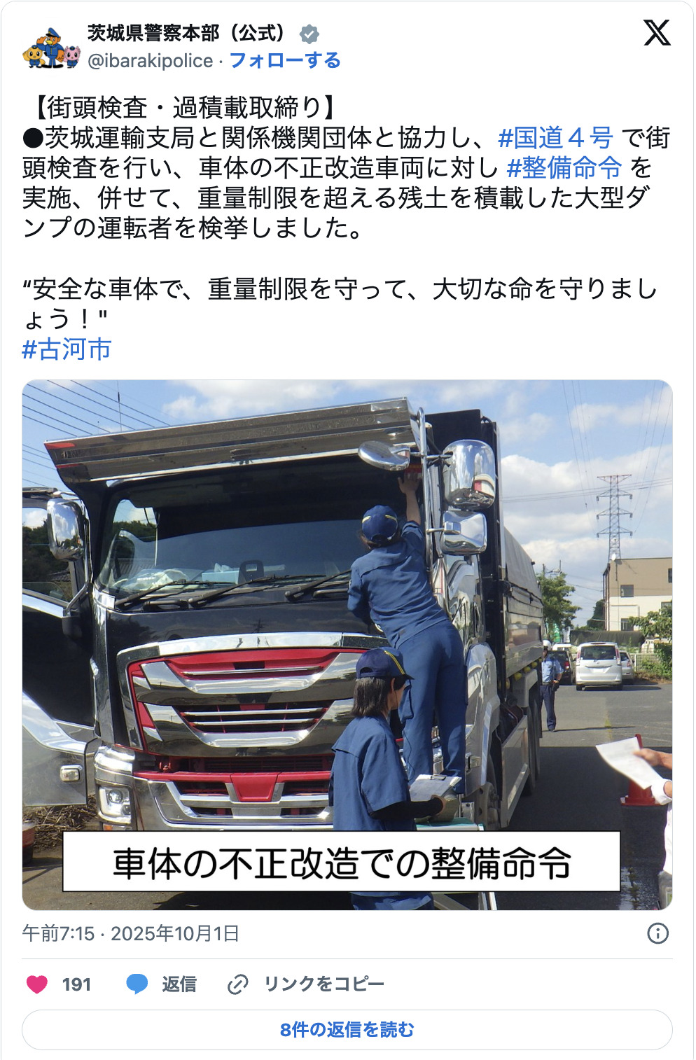 茨城縣警於2025年10月1日更新官方 SNS,宣布在國道4號對違規改裝的大型車下達整備命令,同時也查獲超過重量限制的大型自卸車駕駛。