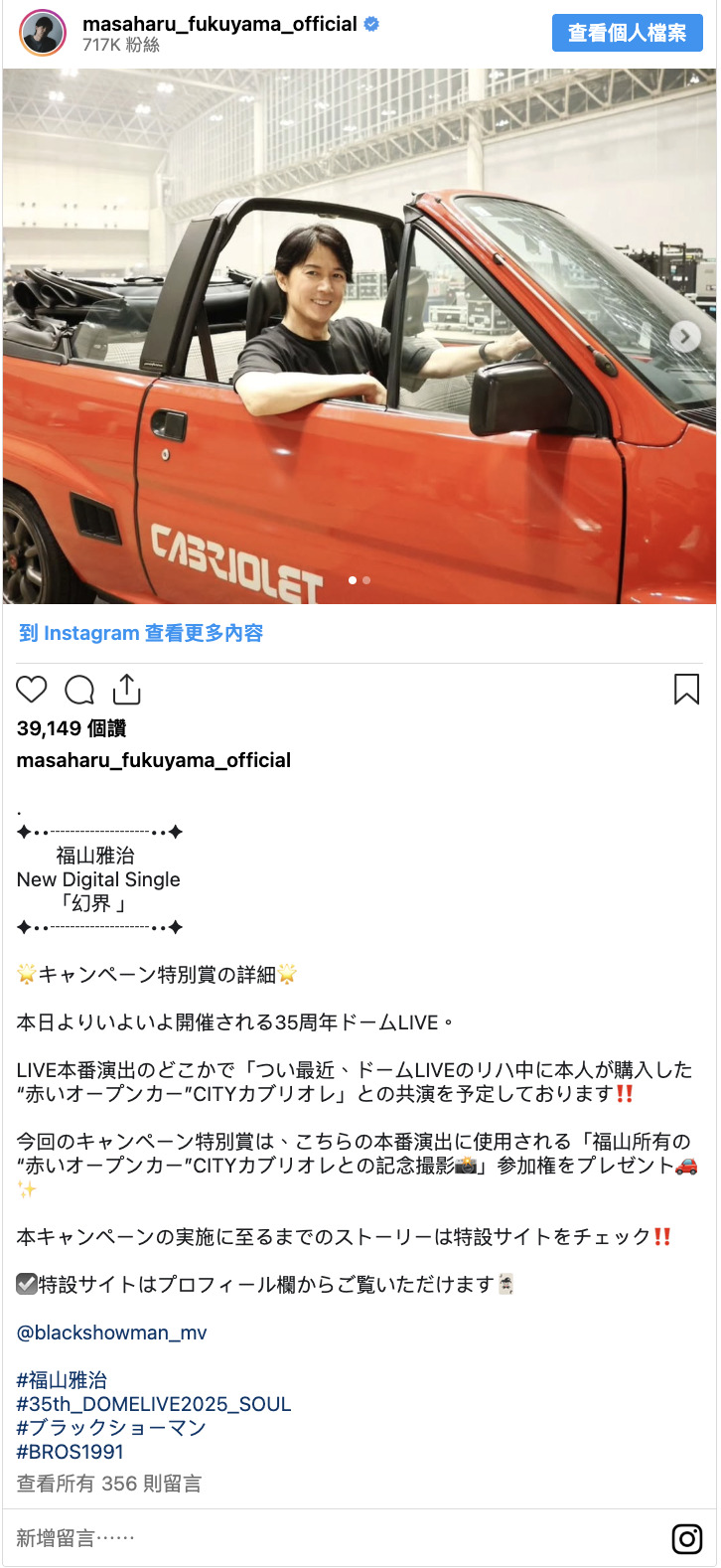 在2025年9月12日播出的節目「タビフクヤマ」中,福山雅治與自己過去的愛車重逢。在回顧出道初期記憶的旅程中,這輛特別的車也隨之登場。