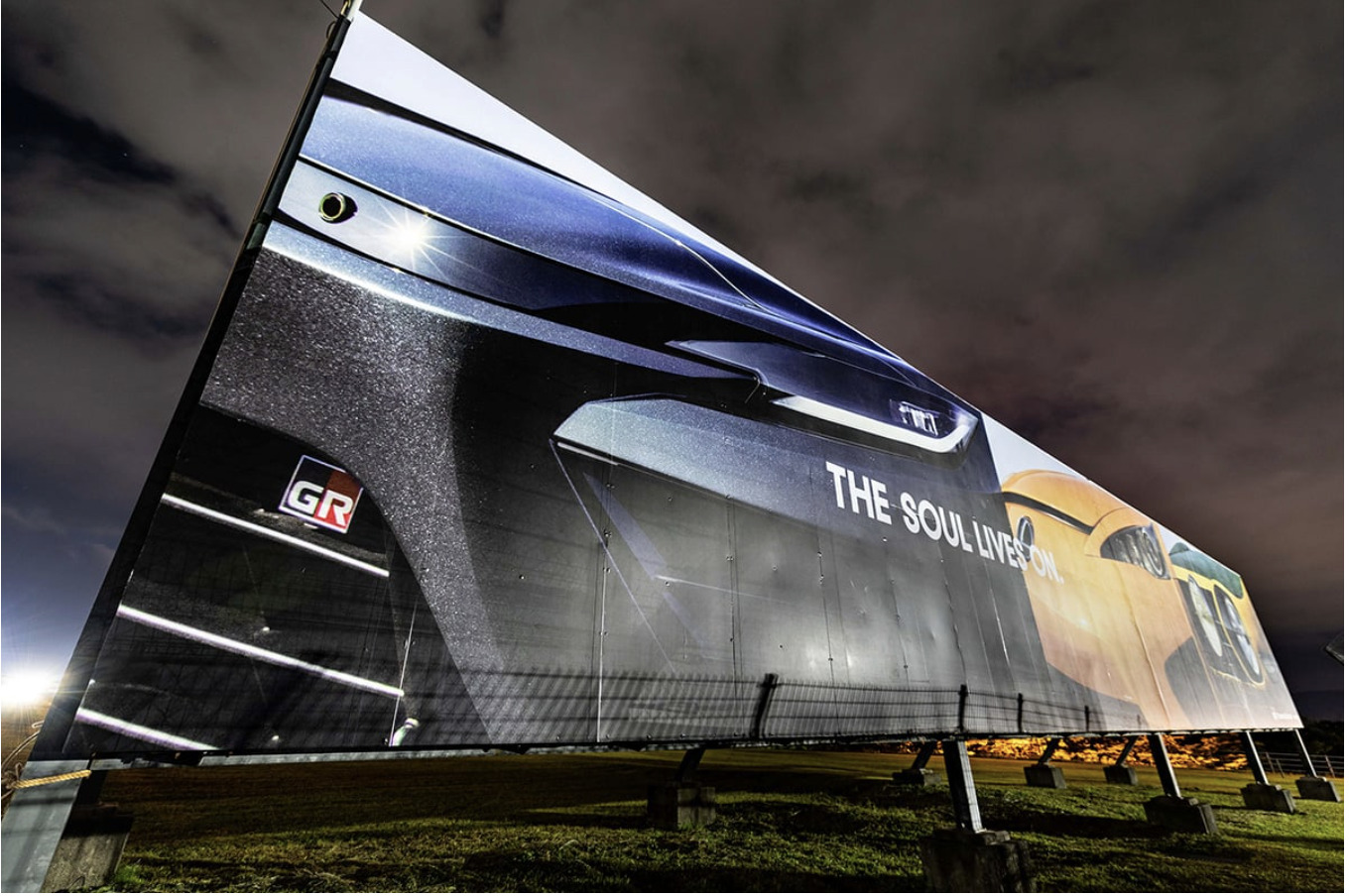 看板上展示了三台車的照片:色彩鮮明的黃綠色2000GT、亮橘色LFA,以及塗成灰色並帶有GR徽章的神秘車款;同時還寫上了標語「THE SOUL LIVES ON.(靈魂永存)」。