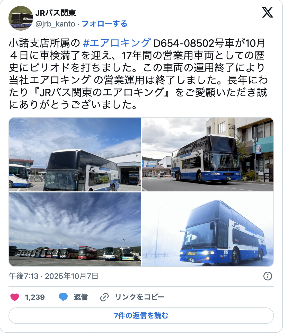 JR巴士關東於2025年10月7日更新官方SNS,宣布旗下雙層巴士三菱Fuso「Aero King」已於10月4日正式退役。