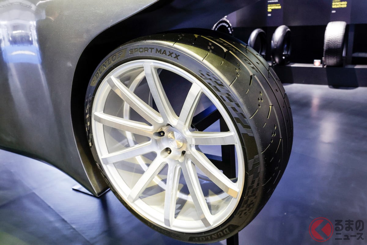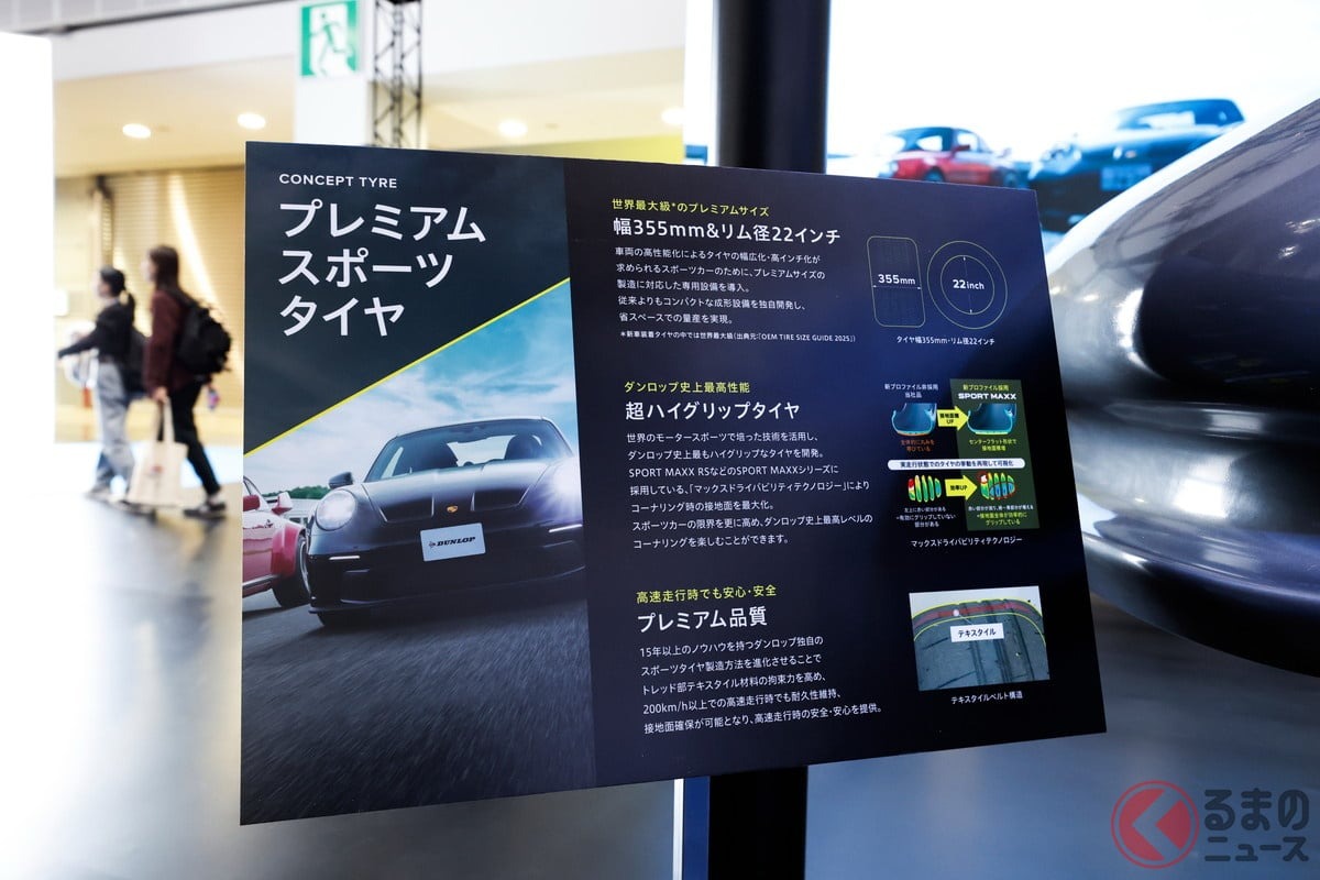 在頂級運動輪胎區,住友橡膠以「SPORT MAXX(Sports Max)」品牌展示概念輪胎,尺寸達到寬355mm、輪圈22吋的超大規格。為了因應近年車輛性能提升所需,該輪胎兼顧大尺寸與更高的抓地力、耐重能力,是迄今為止鄧祿普最具高性能潛力的產品。展區還介紹了如何在節省空間的生產設備中實現量產,使高性能輪胎的製造更具實際可行性。