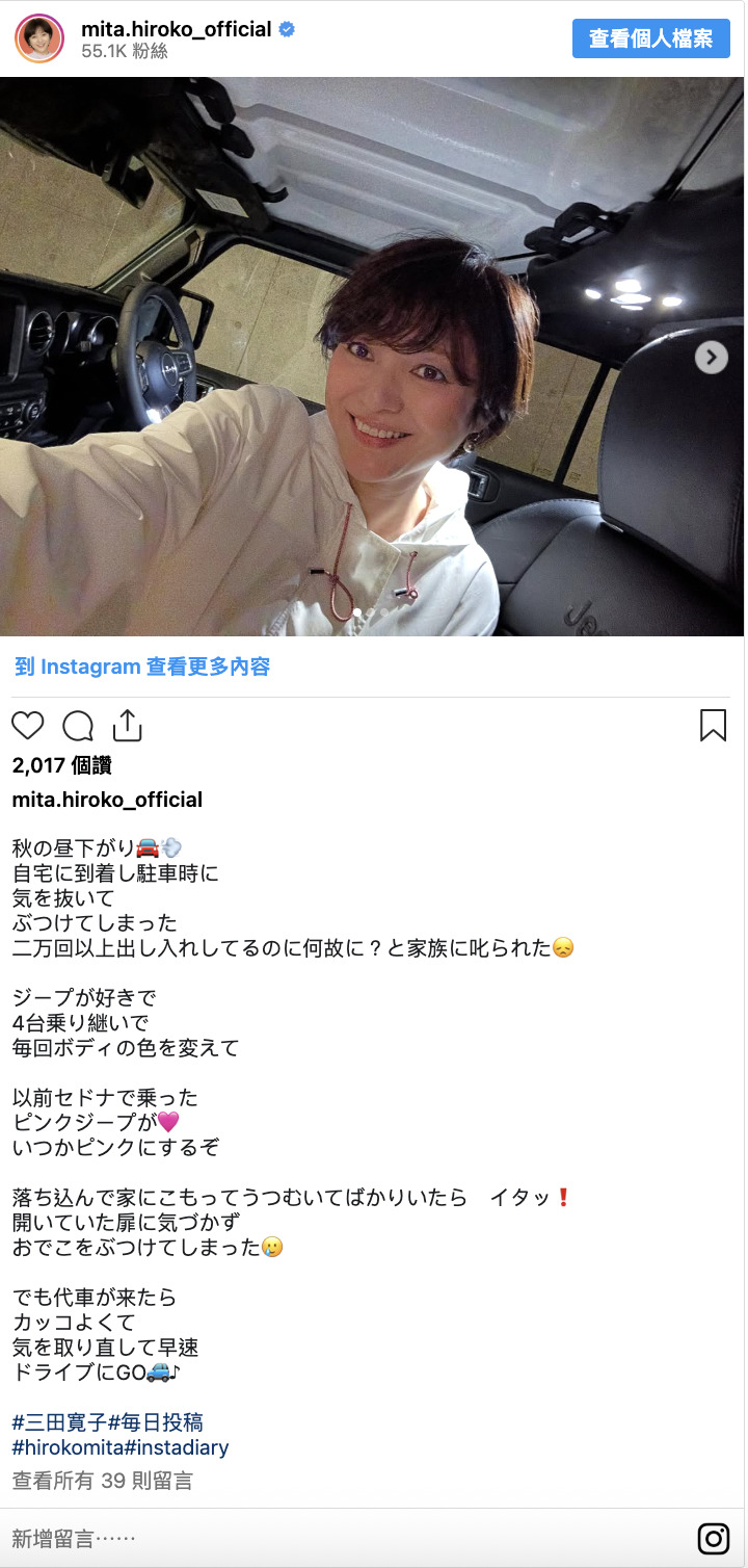 在貼文中,三田寬子寫道:「秋日午後,回到家停車時一不小心撞到了」「雖然已經上下車超過兩萬次,為什麼會這樣?被家人罵了」,以幽默的方式回顧了日常生活中的小插曲。