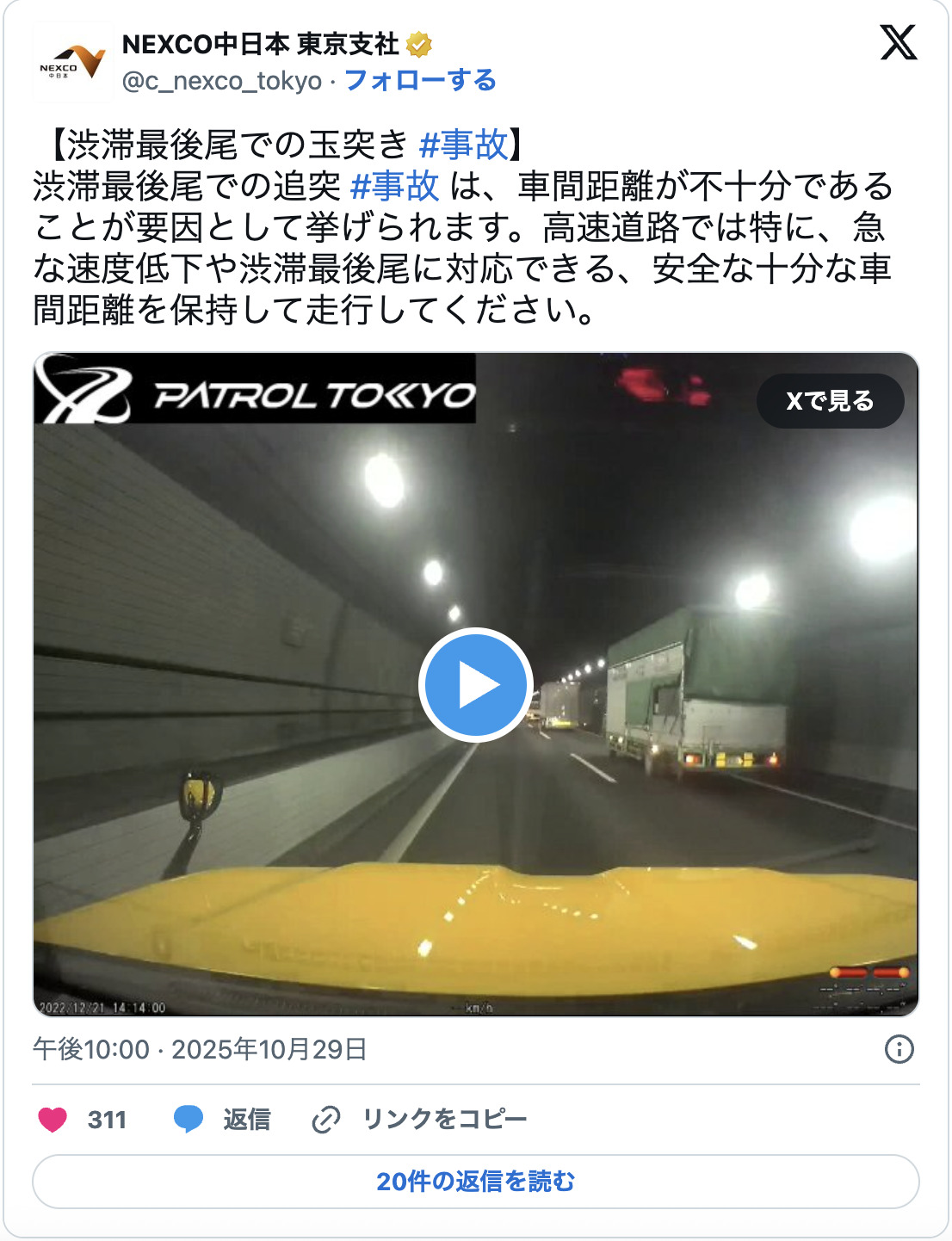 NEXCO中日本在2025年10月29日於官方SNS上公開了一則名為【在塞車尾端發生的連環追撞事故】的影片。