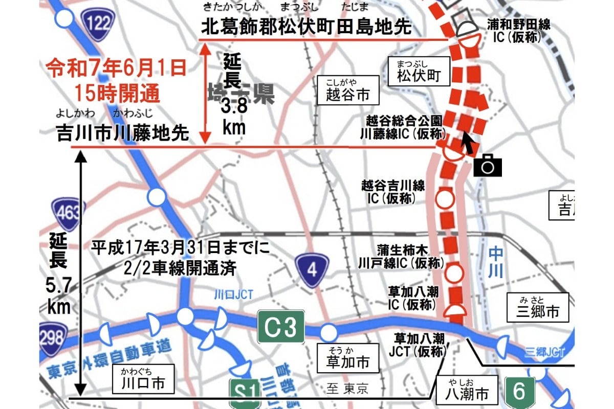 不過,高架部分的收費專用道尚未動工,現階段確定進行事業化的僅限於此次開通至松伏町的區間(暫稱:浦和野田線IC)。