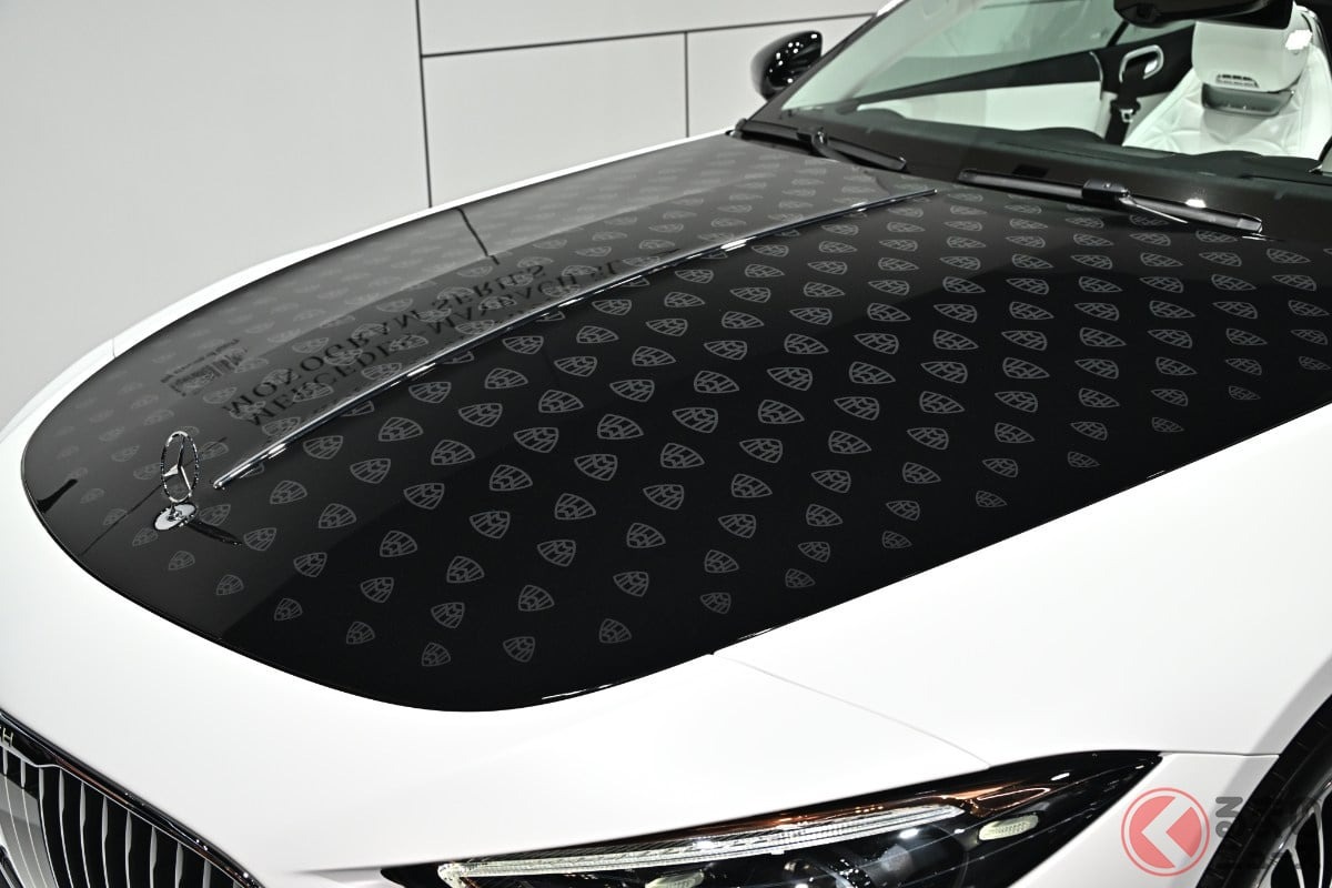 此外,選配項目中還提供「Maybach 標誌專屬引擎蓋」,以 Obsidian Black 車色為基底,搭配 Graphite Gray 的 Maybach 圖案,採用 Pixel Paint 技術與手工印刷結合,呈現高品質的精緻效果。不選用選配時,標準引擎蓋為 Obsidian Black(金屬色),不受車色影響。