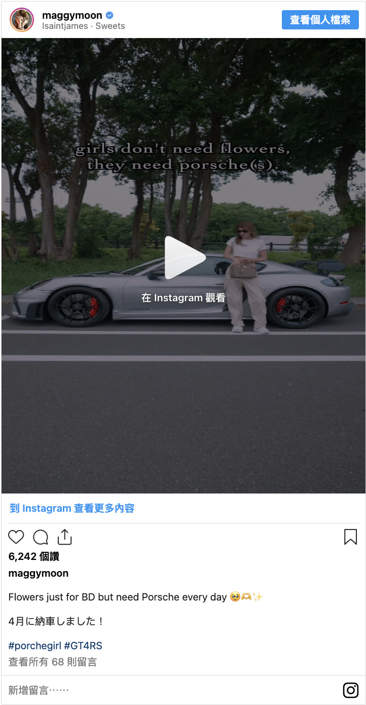 其實 Maggie 早在 2025 年 7 月 21 日更新的 YouTube 頻道「MAGGY’s Beauty and the Speed」影片裡,就公布過 GT4 RS 已經交車。