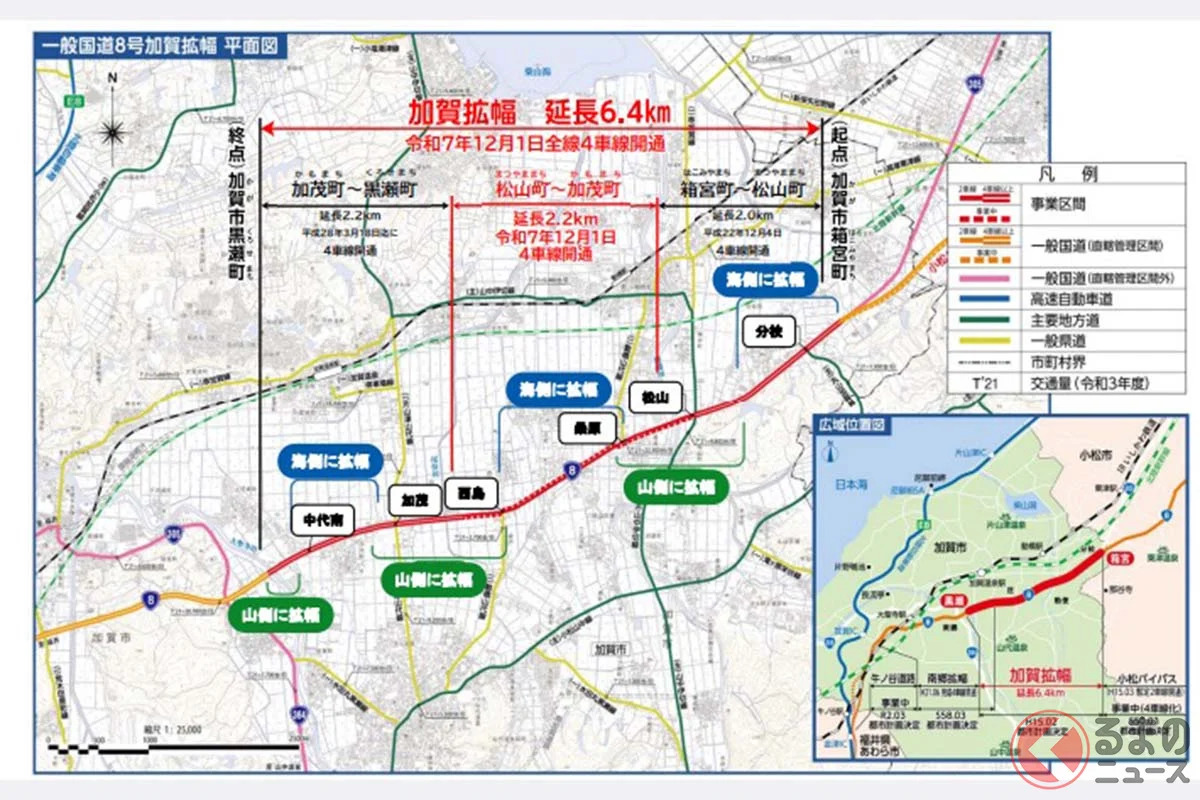 金澤河川國道事務所宣布,國道8號「加賀擴幅」計畫中最後未開通的區間,從石川縣加賀市松山町至加茂町的2.2公里,已於2025年12月1日上午6時全線4車線通車。