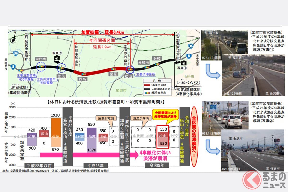 此次開通後,從加賀市箱宮町至黑瀨町的總長6.4公里事業區間全數連接成4車線,長期規劃終於完成。國道8號連結京都市下京區至新潟市中央區,全長約600公里,路線大致沿古老「北陸道」而行。沿途經過近江八幡、彦根、米原、長濱等城市,從琵琶湖南側至東側,並在敦賀通往日本海一側。之後經福井、金澤、富山、糸魚川、上越、柏崎,連結日本海北陸主要城市,直至新潟車站附近。各縣皆已建設旁道,不僅便利地方生活車輛,也方便日本海沿線長途駕駛者行駛,路況相對順暢。