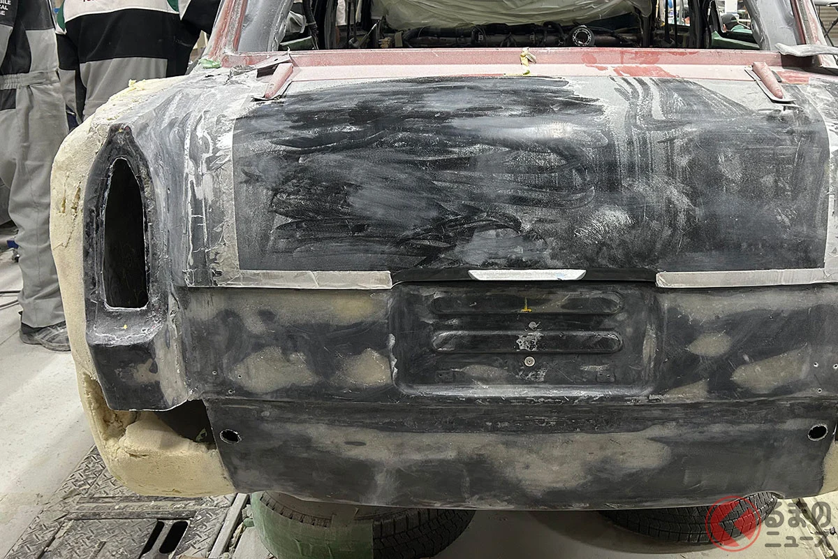 後方方面,行李箱成型已完成。因改變後的後輪拱較大,學生以發泡聚氨酯先塑形,再用 FRP 和填縫材料成型。學生表示,製作後輪拱非常辛苦,「必須從零開始塑形,之後再用填縫整平,去除表面凹凸,過程相當困難」。