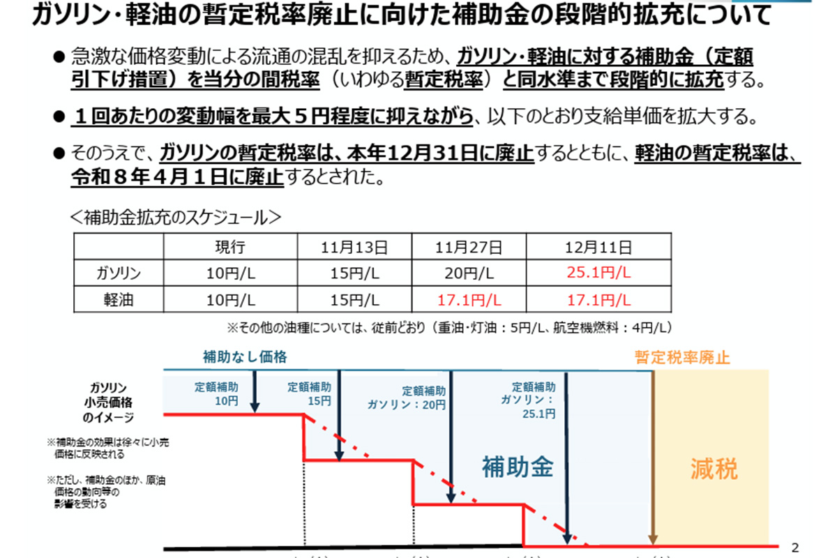 作為政府推動的燃料價格劇烈變動緩和措施之一,從2025年11月27日起,燃料補助金的發放金額進入新的階段。