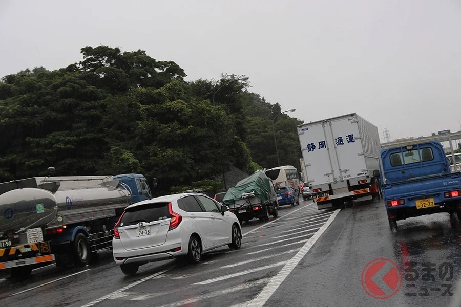 三線道的主線車流量相當少,通行車輛幾乎都是大型車,看起來就像是深夜時段。