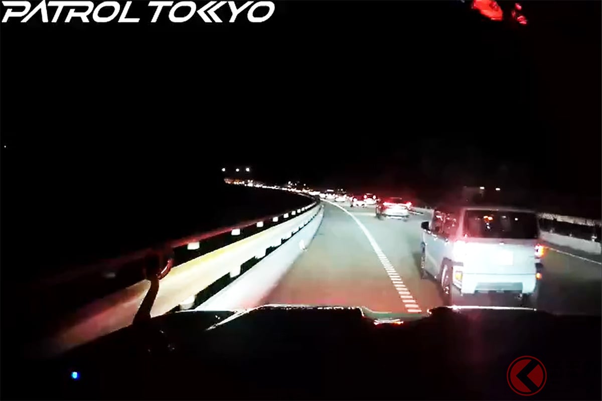 這段影片是夜間高速公路的行車記錄器畫面。主線車道出現嚴重壅塞,車陣綿延不絕。此時,開啟紅色警示燈並鳴響警笛的NEXCO道路巡邏車接近現場。由於主線車道堵塞,巡邏車改走左側路肩(路側帶)加速前往目的地。關鍵瞬間發生在巡邏車準備從一輛水藍色的輕型車左側通過時。原本行駛在主線上的輕型車,突然將方向盤往左打,直接朝巡邏車行駛的路肩方向靠近。彷彿直接切入巡邏車前方一般,迫使巡邏車緊急煞車,畫面記錄下幾乎發生碰撞的驚險瞬間。