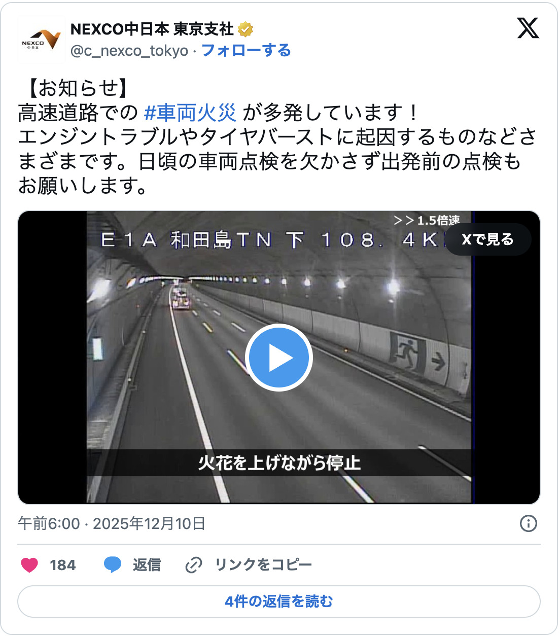 NEXCO中日本於2025年12月10日,透過官方SNS帳號,呼籲大眾留意接連發生的車輛火災,同時公開了真實的火災影像。