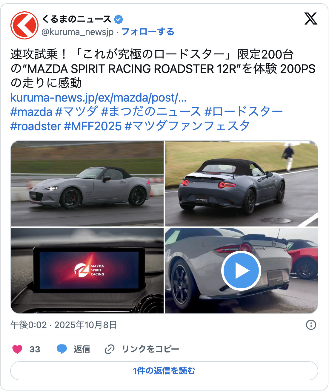 關於「馬自達精神賽道敞篷跑車(Mazda Spirit Racing Roadster)」的最新消息,我們向經銷商做了詢問。