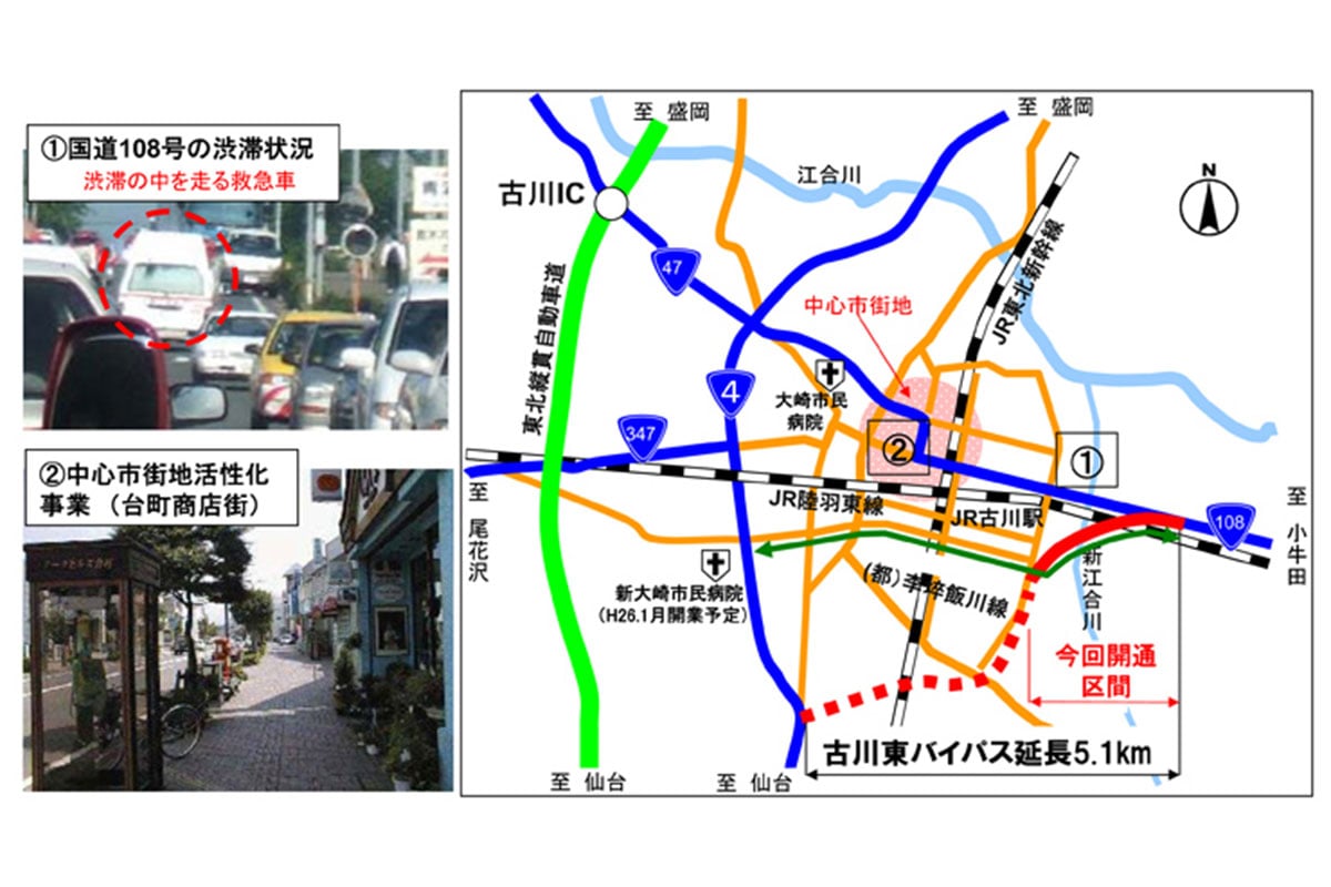 過去,國道108號與國道4號的交會點僅位於停靠東北新幹線的JR古川站西北側一處,在市區東南側必須經過多個路口才能銜接,整體動線稱不上有效率。