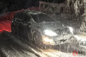 然而,即便有這樣的提醒,1月11日大約下午3點左右,在阿智村國道153號初澤隧道前,一輛普通乘用車還是發生了打滑卡住的情況。