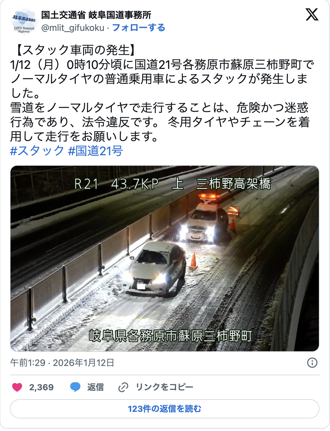 國土交通省岐阜國道事務所在官方SNS上指出,2026年1月12日深夜,發生了一起使用一般輪胎車輛卡在路上的事件。