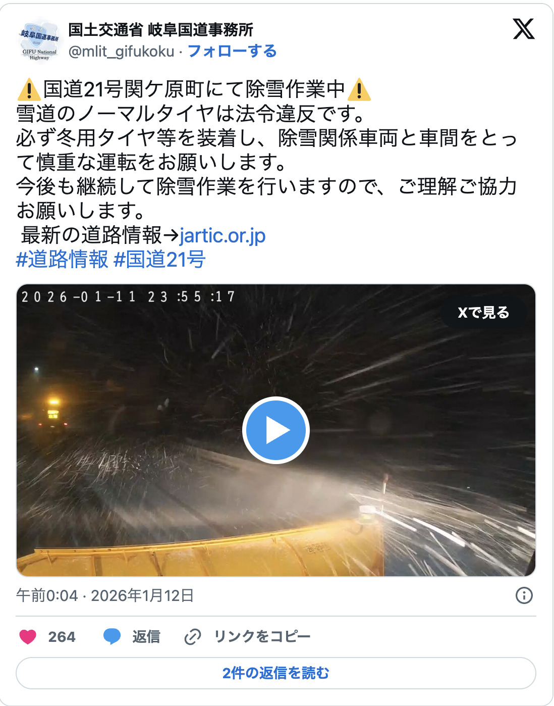 岐阜國道事務所在官方SNS上貼出了現場道路攝影機的畫面,同時對這起明明已經反覆呼籲做好雪地準備卻仍發生的行駛困難事件,表達了強烈的不滿,語氣嚴厲地寫道: