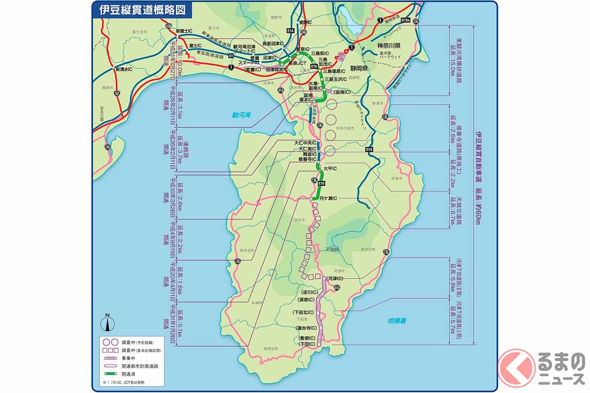 伊豆半島自古以來就是著名觀光地,但在道路基礎建設方面,缺乏縱貫南北的高規格道路,尤其在觀光旺季,國道136號與國道414號等幹線道路經常出現嚴重塞車,長期以來都是一大問題。