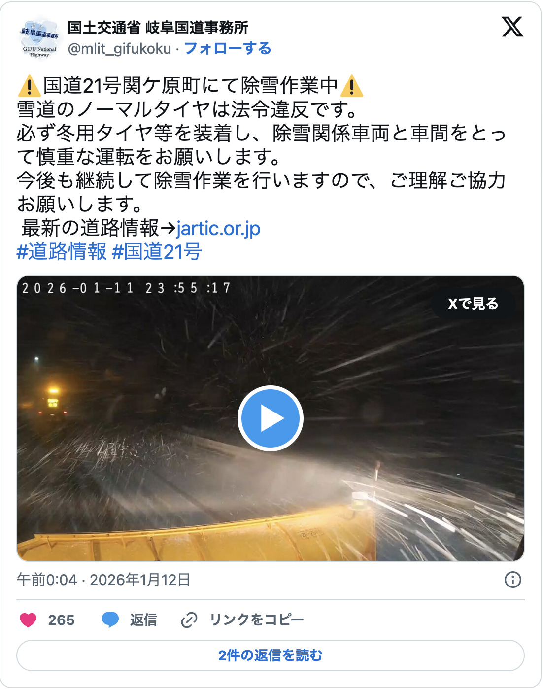 國土交通省岐阜國道事務所在官方社群媒體上公布,2026年1月12日深夜發生了一起普通輪胎車輛打滑卡住的事件。這則貼文在SNS上引發了各種反響。