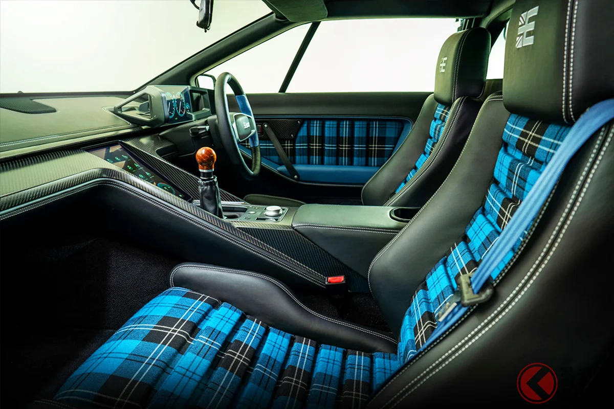 內裝為黑色基調的雙座配置,座椅靠背、門飾板及方向盤皆加入藍色點綴。儀表區保留原車的環抱式設計感,但換裝為現代數位儀表。