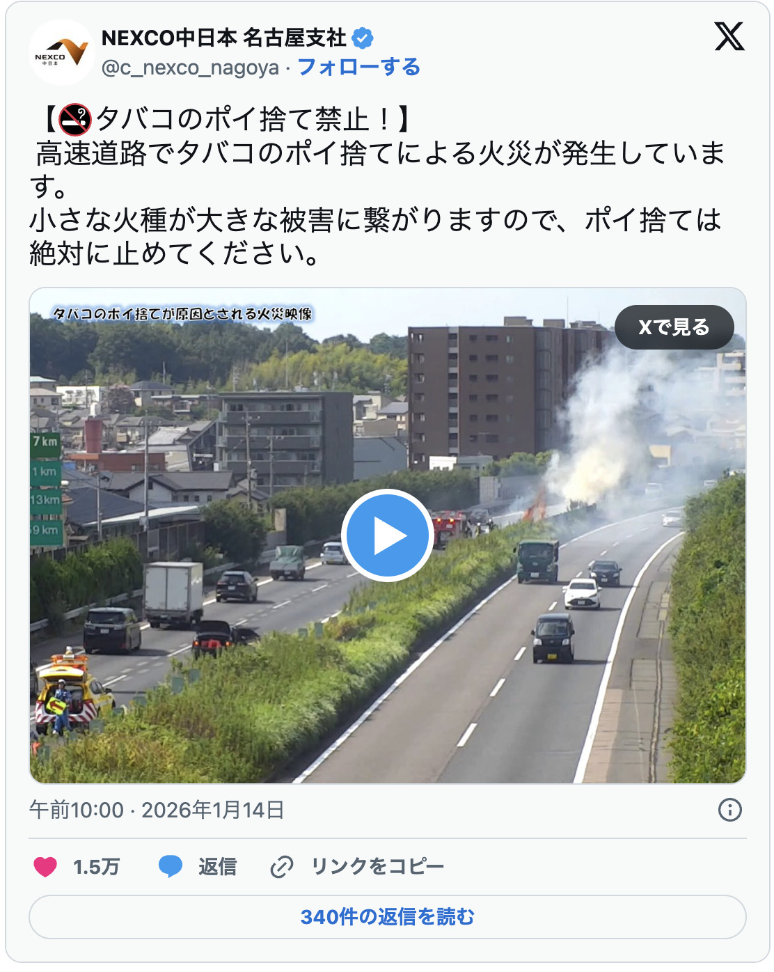 NEXCO中日本名古屋支社於2026年1月14日更新官方SNS,附上一段影片,呼籲民眾注意高速公路上發生的火災事故。