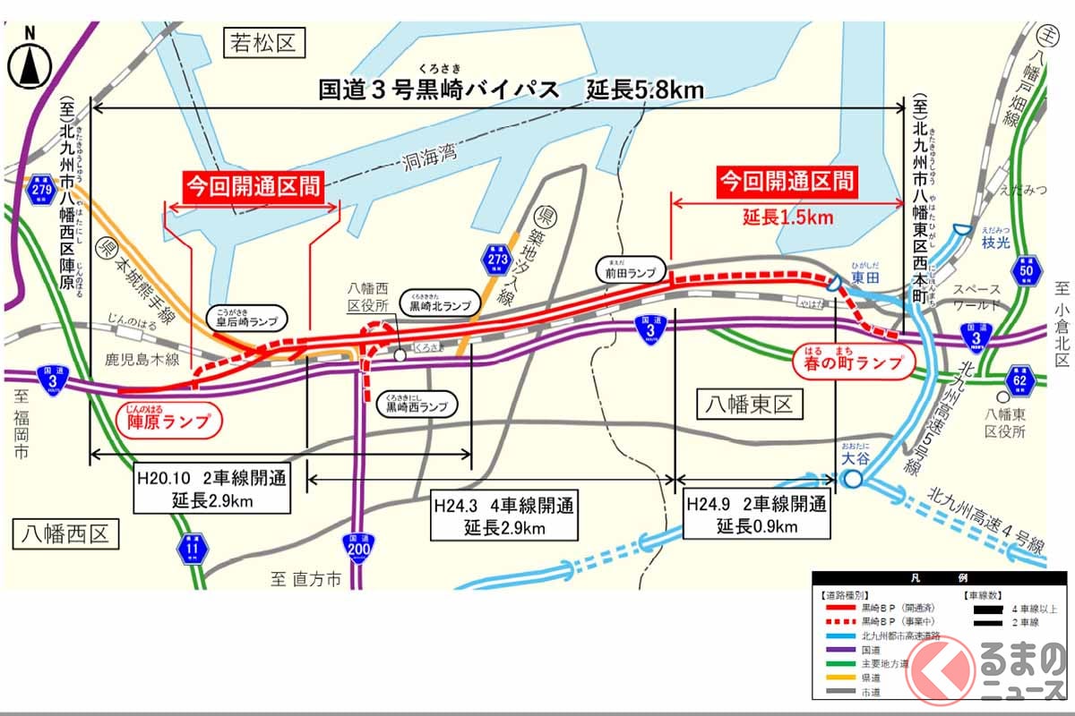 其中,黑崎繞道是國道3號的一段替代道路,總長約5.8公里,施工範圍橫跨北九州市八幡東區至八幡西區。