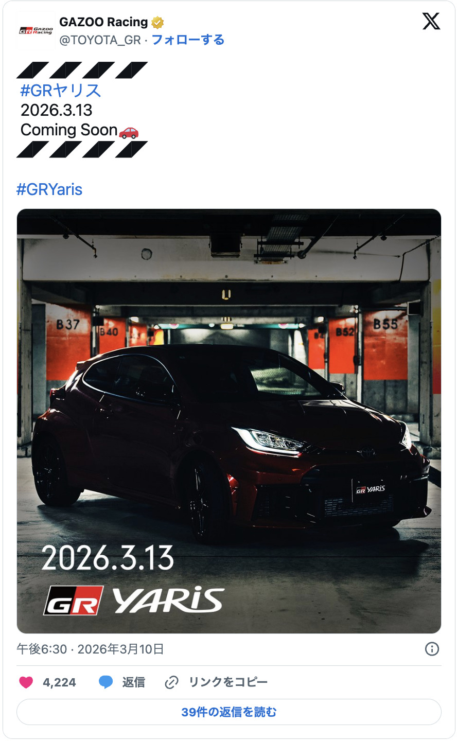 2026年3月10日,TOYOTA GAZOO Racing在官方X(舊Twitter)帳號上,公開了一張預告全新「GR Yaris」即將登場的teaser圖片。