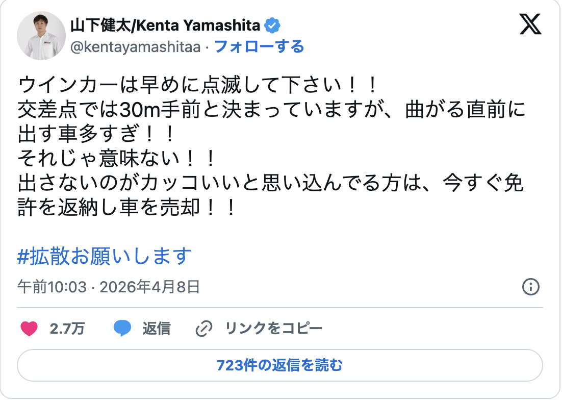 4月8日,賽車手山下健太在自己的X上發表的一則貼文引發了廣大迴響。他在SNS上以相當強烈的語氣呼籲「方向燈要提早打」,成為熱門話題。另一方面,也有不少人指出存在「不打方向燈的地方性駕駛習慣(ご当地ルール)」。