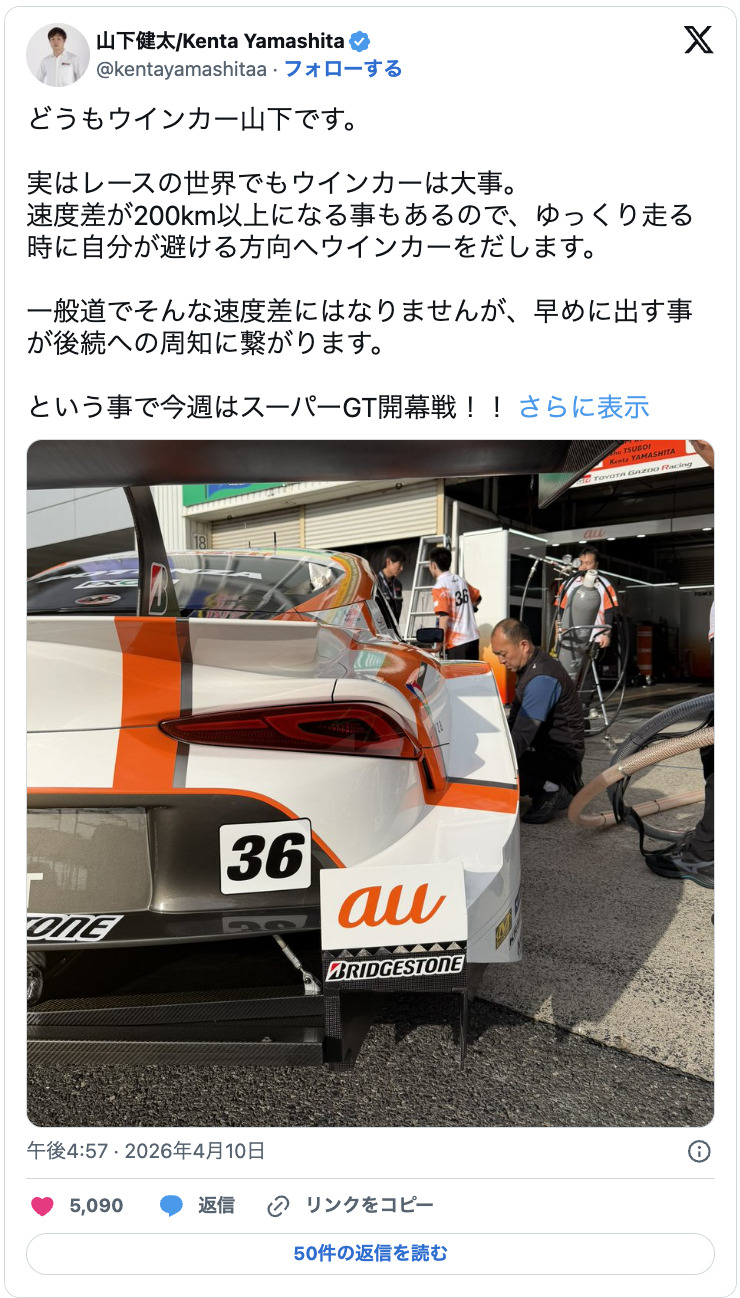 4月8日,山下健太在X上的發文迅速擴散。他曾在2016年拿下全日本F3冠軍,並於2019年奪得SUPER GT(GT500)冠軍,是一位頂尖賽車手。他針對汽車打方向燈的方式,用相當直接的語氣提醒大家: