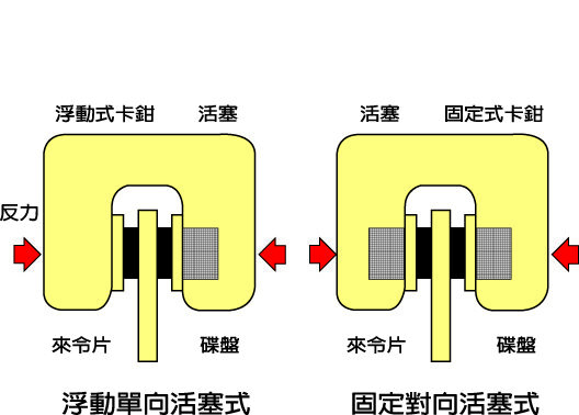 就許多房車配置的單活塞卡鉗來說,來令片與碟盤的接觸面積會有剩下無法填滿的無用面積,為了加大摩擦面積,並求得卡鉗本體的體積縮減、提高活塞面積的最大量,因此才會有多活塞卡鉗的出現。這種屬於固定式的對向多活塞夾鉗,除具有總體剛性佳、夾力強、力量平均與反應迅速的優點外,採用鋁合金材質製造而成的本體,本身也能提供優於原廠鑄鐵材質的輕量化與散熱效果,可有效減少大尺寸碟盤組的重量,並降低煞車油的工作溫度,煞車系統自然能提供較為穩定的制動效果,因此才會有這麼多性能車配置多活塞卡鉗。