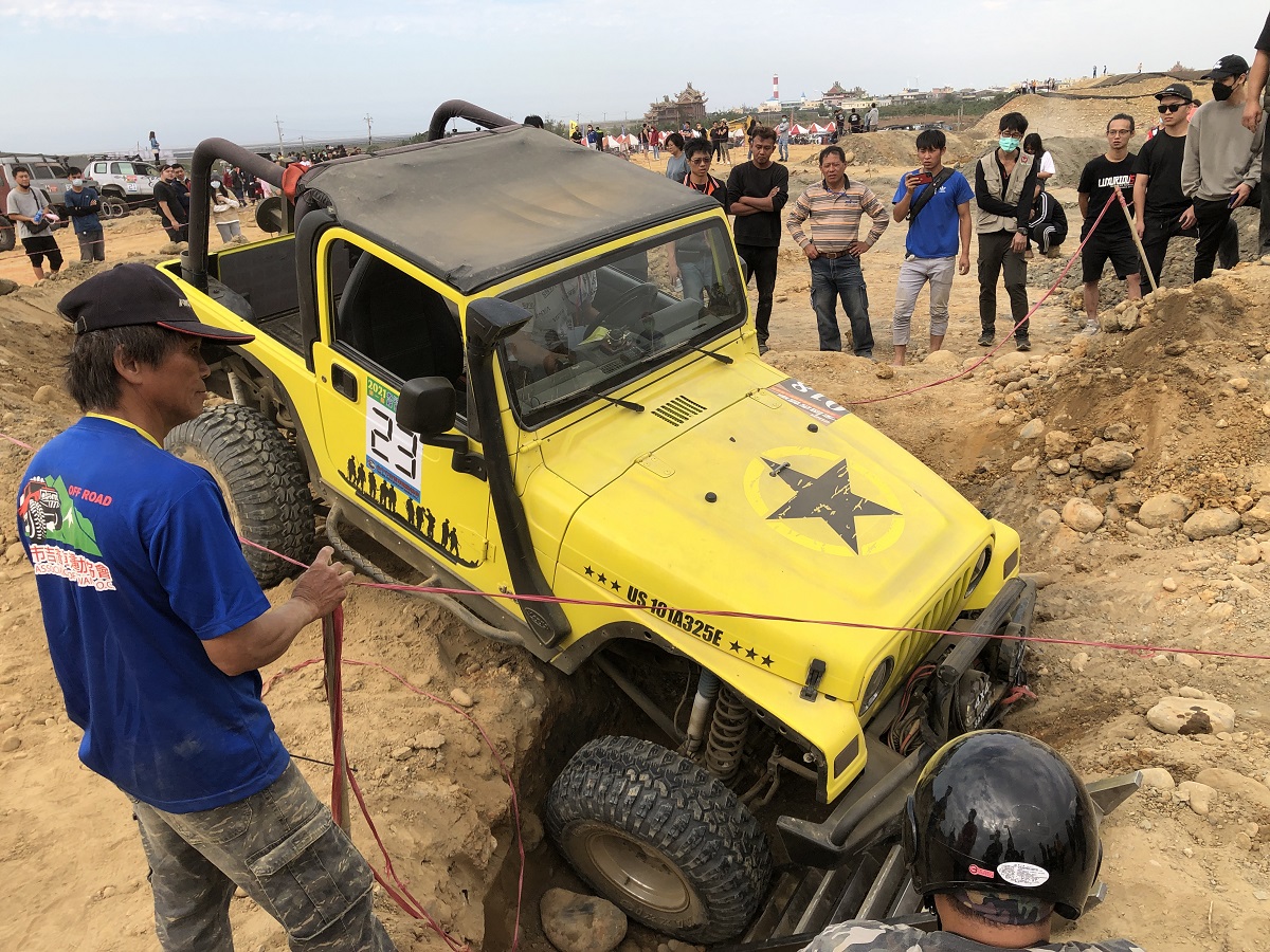 從整個越野場地與賽事分組來看,可以發現這場比賽主要分成兩種類別,一種是繞錐比速度,另一種是越野比技巧,前者的是透過地上擺放三角錐的方式,規劃出一條沙地賽道,讓車輛能在上面奔馳,計算跑完的時間長短來分出勝負,有點像金卡納一樣,比較適合改裝幅度比較小的吉普車、貨卡與SUV來參加,不過主辦單位為了增加比賽難度與精采度,在賽道內特地挖了一條深約2米的坡道,讓比賽車主須控制通過車速,以確保車輛能順利爬上坡道,且上來時不會有過度飛躍傷及底盤的情況發生。